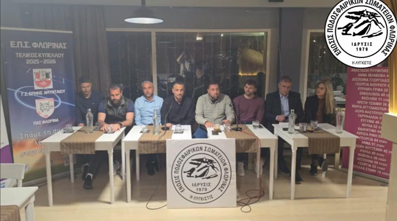 Κοινή συνέντευξη τύπου έδωσαν μέλη του Δ.Σ. της ΕΠΣ Φλώρινας και εκπρόσωποι του Δήμου Φλώρινας και του Συμβουλευτικού Κέντρου Φλώρινας την Πέμπτη 19 Μαρτίου στο ξενοδοχείο King Alexander στη Φλώρινα.για τον Τελικό Κυπέλλου ΕΠΣ Φλώρινας 2025-2026, που θα πραγματοποιηθεί το Σάββατο 28 Μαρτίου στις 15:00 στο Δ.Α.Κ. Φλώρινας.